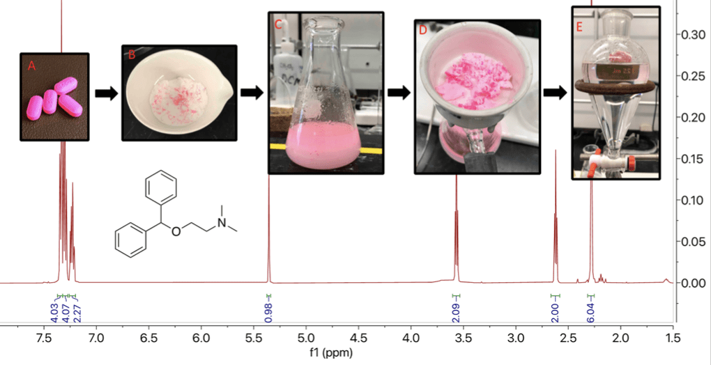 Dans cette série d’expériences, les principes actifs de médicaments courants sont extraits de comprimés commerciaux et identifiés par spectroscopie infrarouge et de RMN du proton.