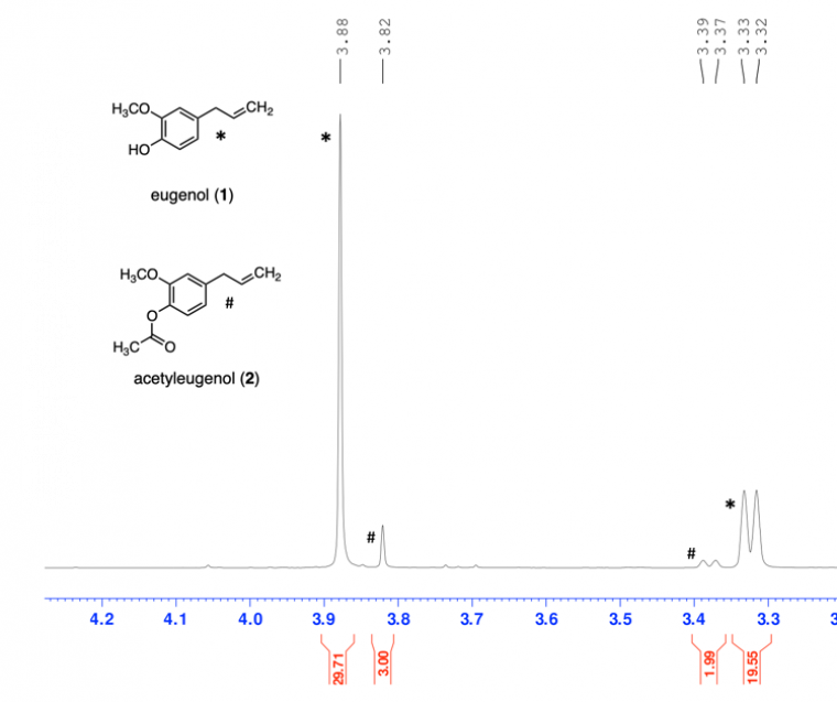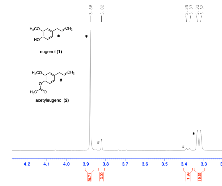 L’extraction classique de l’huile essentielle de clous de girofle est ici réalisée avec une machine à expresso, et l’eugénol et l’acétate d’eugényle, principaux constituants de l’huile extraite, sont séparés par extraction liquide/liquide. Les produits extraits sont caractérisés par spectroscopie infrarouge et de RMN du proton, ainsi que par chromatographie en phase gaz. L’analyse des intégrations du spectre RMN (fourni) de l’huile essentielle permet de déterminer les proportions d’eugénol et d’acétate d’eugényle dans celle-ci.