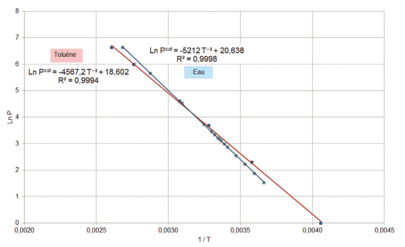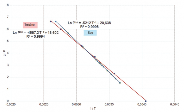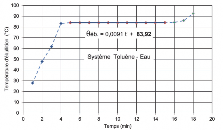 L'intersection de deux droites fournit la température de l'hétéroazéotrope.