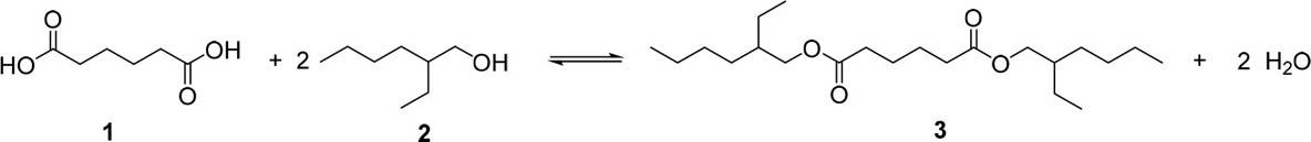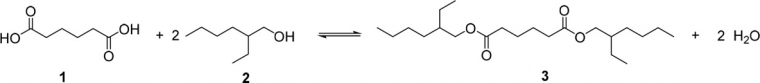 La synthèse d’un plastifiant, le DEHP, est réalisée par estérification de l’acide adipique et du 2-éthylhexan-1-ol. Cette synthèse est réalisée sans solvant avec un léger excès d’alcool et l’eau formée est retirée par distillation du mélange eau/alcool avec recyclage de l’alcool. L’avancement de l’estérification est déterminé par dosage des fonctions acides restantes. La RMN du proton permet de détecter et éventuellement de doser l’alcool restant dans l’ester isolé.