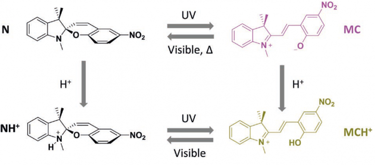 L’article traite d’un composé photochrome appartenant à la famille des spiropyranes pouvant exister sous deux isomères : une forme incolore dite N (pour normale) et une forme violette dite MC (pour mérocyanine). La transposition de N à MC a lieu sous irradiation UV alors que la réaction retour à N s’effectue spontanément. L’originalité du composé tient au fait que les deux formes préalablement citées sont des monobases dont il est aussi possible de passer des formes acides NH+ (incolore) à MCH+ (jaune) sous irradiation UV. Par contre, sous formes acides, la réaction retour n’a pas lieu spontanément, une irradiation dans le visible est alors nécessaire.