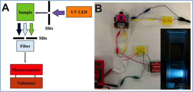 Un autre exemple de construction de spectrofluorimètre avec du matériel différent. Il est utilisé tout d’abord pour étudier des solutions de fluorescéine, puis pour une expérience de biologie moléculaire.