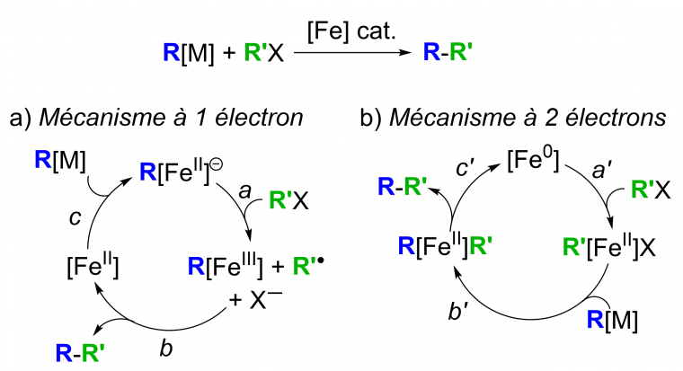 b) voie biélectronique, avec une addition oxydante (a') suivi d'une transmétallation (b') et d'une élimination réductrice (c')