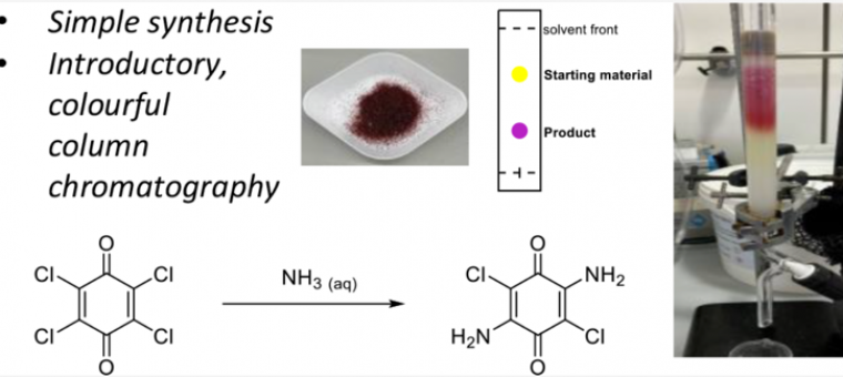 La transformation du chloranil jaune en quinone pourpre par réaction avec une solution aqueuse concentrée d'ammoniac sert de base à un TP d’introduction de la chromatographie sur colonne. Cet exemple peut aussi être intéressant pour l’étude de la CCM.