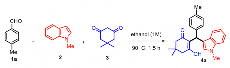 L’article décrit une réaction à trois composants faisant intervenir un aldéhyde aromatique, un indole et la dimédone. Le mode opératoire est très simple, l’avancement peut être suivi par CCM et les spectres de RMN et infrarouge sont fournis. Plusieurs réactifs différents ont été testés, le budget et le rendement dépendent des substituants présents sur l’aldéhyde et l’indole.