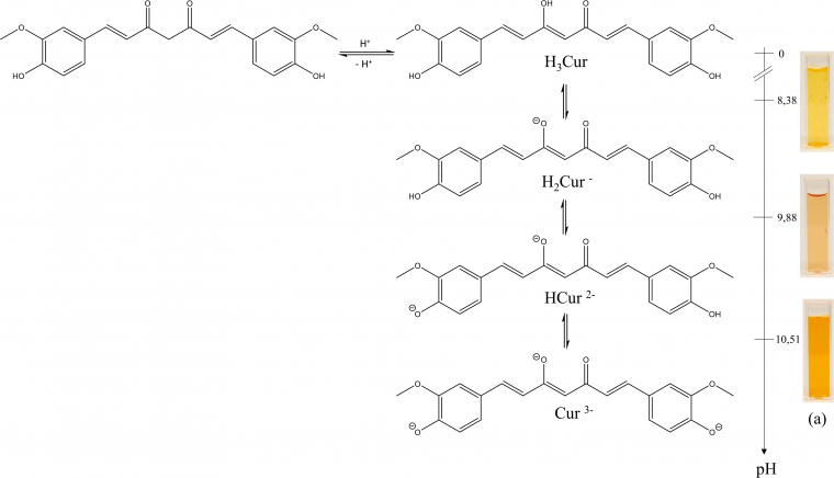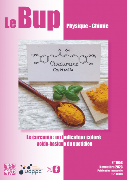 Une fois solubilisé, le curcuma confère à sa solution des couleurs différentes selon le pH de celle-ci, du fait de la présence de différentes formes acido-basiques du curcuminoïde majoritaire, la curcumine notée H3Cur (figure ci-après). Cette propriété en fait un excellent candidat pour une utilisation comme indicateur coloré acido-basique. Dans cet article, les pKa de deux couples acido-basiques du curcuma sont déterminés par spectrophotométrie UV-visible dans un milieu dont le pH est contrôlé finement grâce à l’utilisation d’un tampon universel. Plusieurs utilisations pratiques du curcuma comme indicateur coloré sont détaillées dans la Partie B de cette étude, qui seront publiées dans le numéro de décembre 2023.