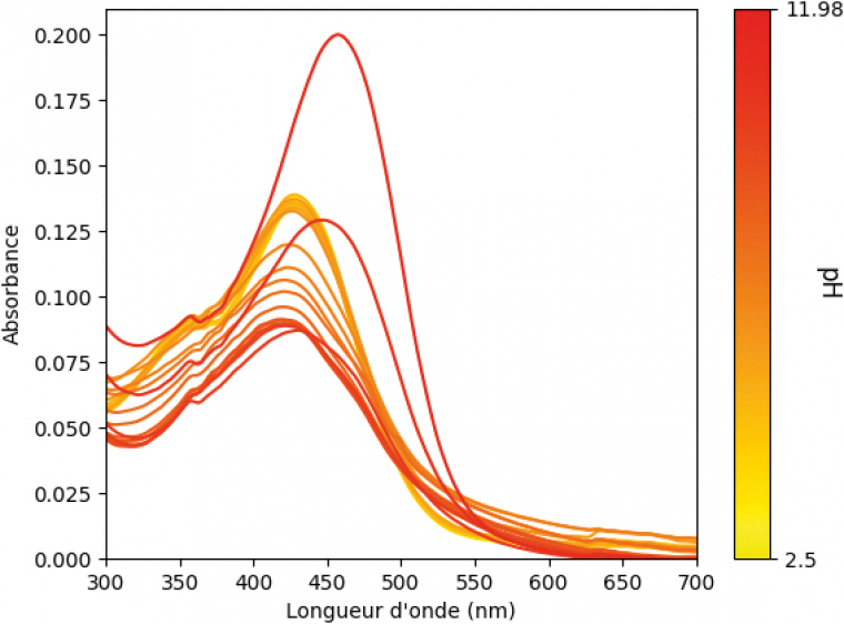Les auteurs mettent en œuvre une méthode spectroscopique en mesurant l’absorbance d’une solution de curcuma en fonction du pH, à l’aide d’un « tampon universel » à base d’acide acétique, d’acide phosphorique et d’acide borique dont le pH est ajusté à l’aide d’une solution concentrée d’hydroxyde de sodium. Voici l’évolution du spectre de la solution en fonction du pH :