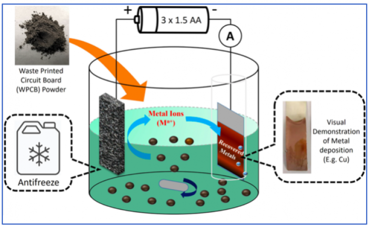L’électrodéposition de cuivre à partir d’une suspension de cuivre ou de poudre de déchets de circuits imprimés permet d’illustrer le recyclage de métaux présents dans des déchets électroniques. La masse de métal déposé permet de déterminer le rendement faradique, et le dépôt est analysé par ICP-MS.