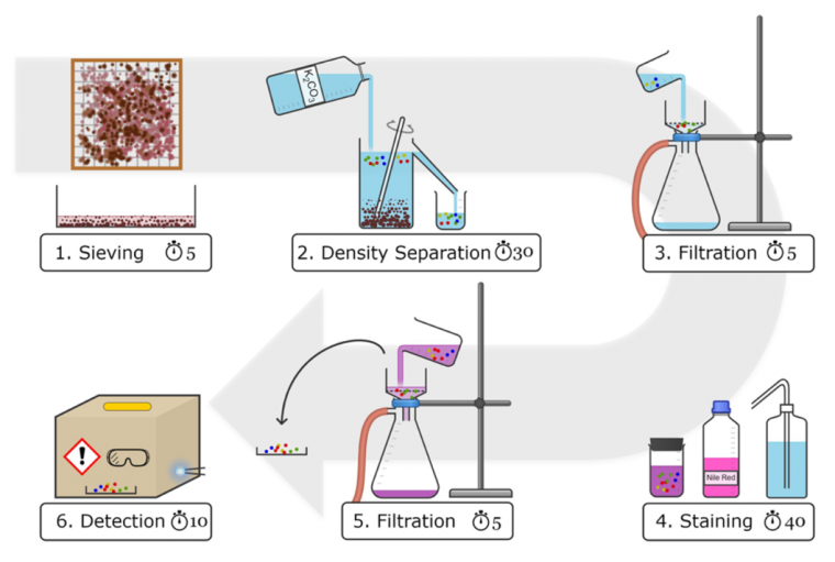 Au cours de la séance de travaux pratiques décrite dans cet article, des particules de microplastiques sont séparées par gravité d’une matrice de sédiments dans une solution saturée de carbonate de potassium, puis ces particules sont détectées par fluorescence après avoir été teintées par du rouge du Nil.