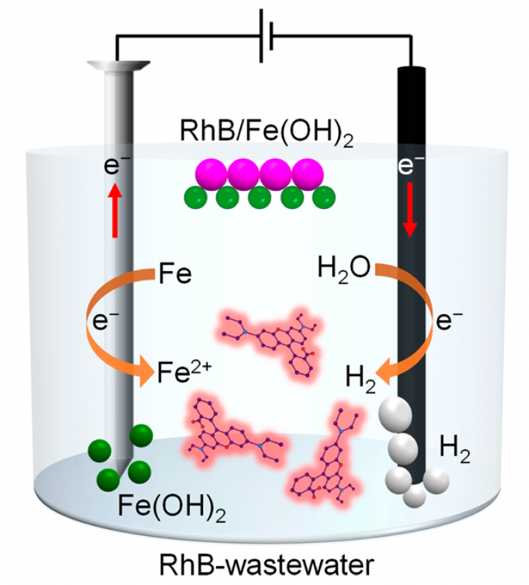 L’oxydation d’une anode de fer dans une cellule d’électrolyse conduit à la formation de particules hydroxyde de fer (II) qui adsorbent un polluant, ici la rhodamine B, ce qui conduit à son élimination par floculation. La dépollution est suivie par spectrophotométrie.
