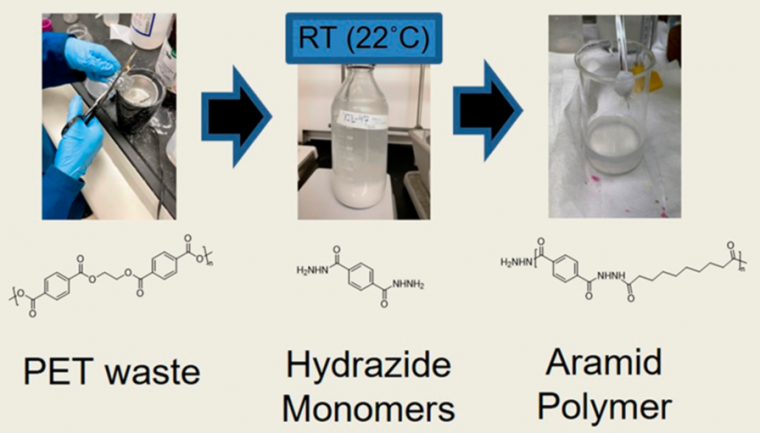 Cet article décrit la dépolymérisation du PET par réaction avec l’hydrazine puis l’utilisation du monomère obtenu pour synthétiser un nouveau polymère. La toxicité des réactifs (hydrazine en particulier) limite les possibilités de mise en œuvre de ces expériences en travaux pratiques.